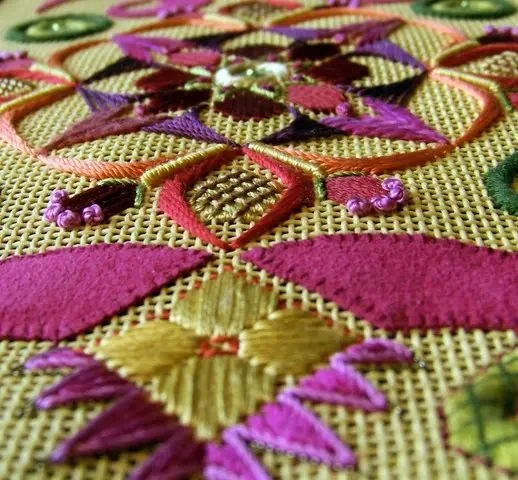 Color is Orna Willis’ greatest fascination. Design and architecture have always intrigued Orna and her use of geometric shapes is what she brings from that love. Her work is meant to bring pleasure, first to the senses, then to the mind. When the senses are stimulated, the mind will work all the better. Her art is her story, told with a needle and hand dyed fibers. The dance of Middle Eastern color with the structure of mathematics intrigue Orna. She paints with her needle and tells the tale of tradition, history, and origin in a contemporary way.