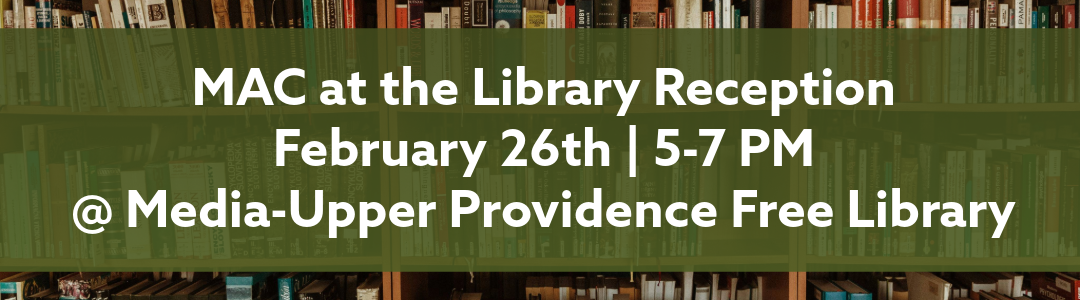 MAC at the Library is a collaboration between Media Arts Council and the Media-Upper Providence Free Library. Our temporary rotating exhibit located in the Media-Upper Providence Free Library features curated works available for sale and appreciation, with a portion of every sale going to MAC and the Library.