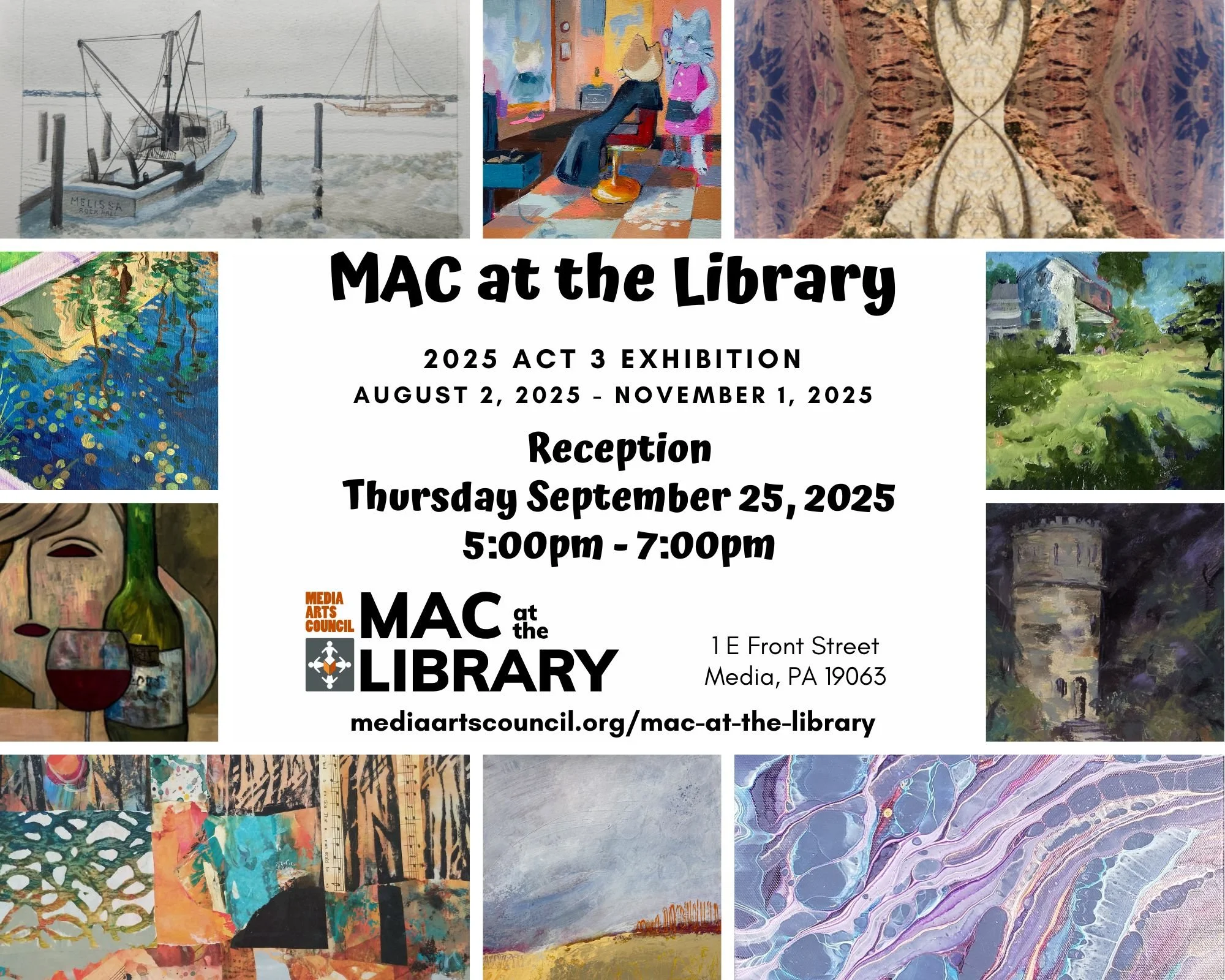 MAC at the Library is a collaboration between Media Arts Council and the Media-Upper Providence Free Library. Our temporary rotating exhibit located in the Media-Upper Providence Free Library features curated works available for sale and appreciation, with a portion of every sale going to MAC and the Library.
