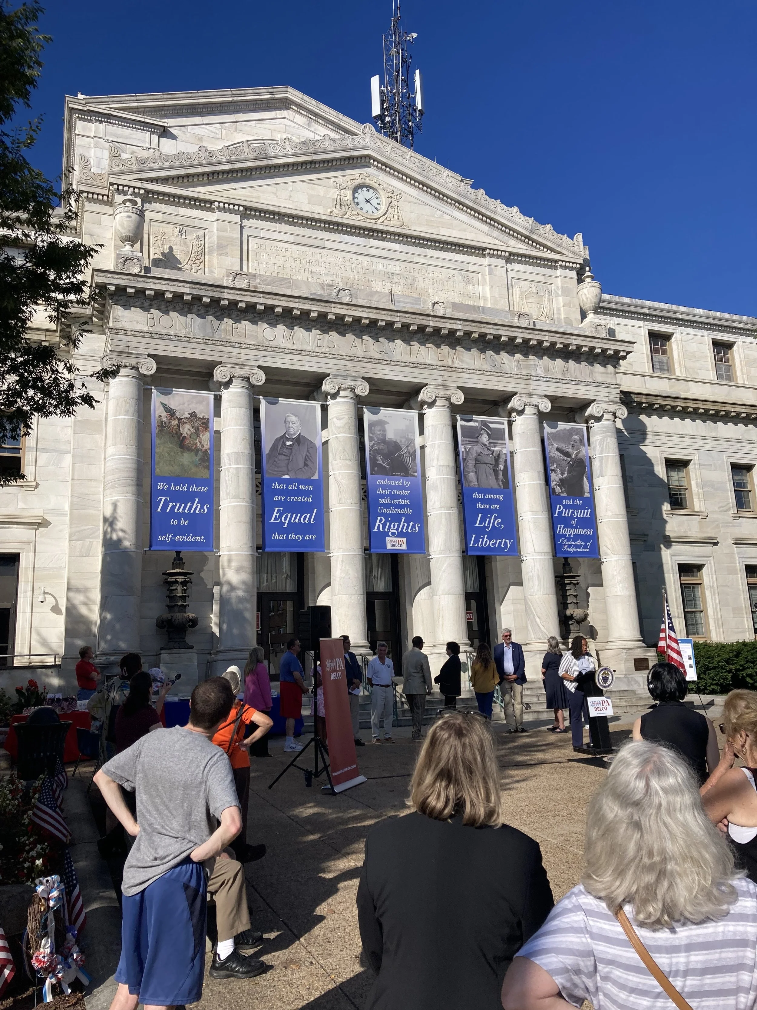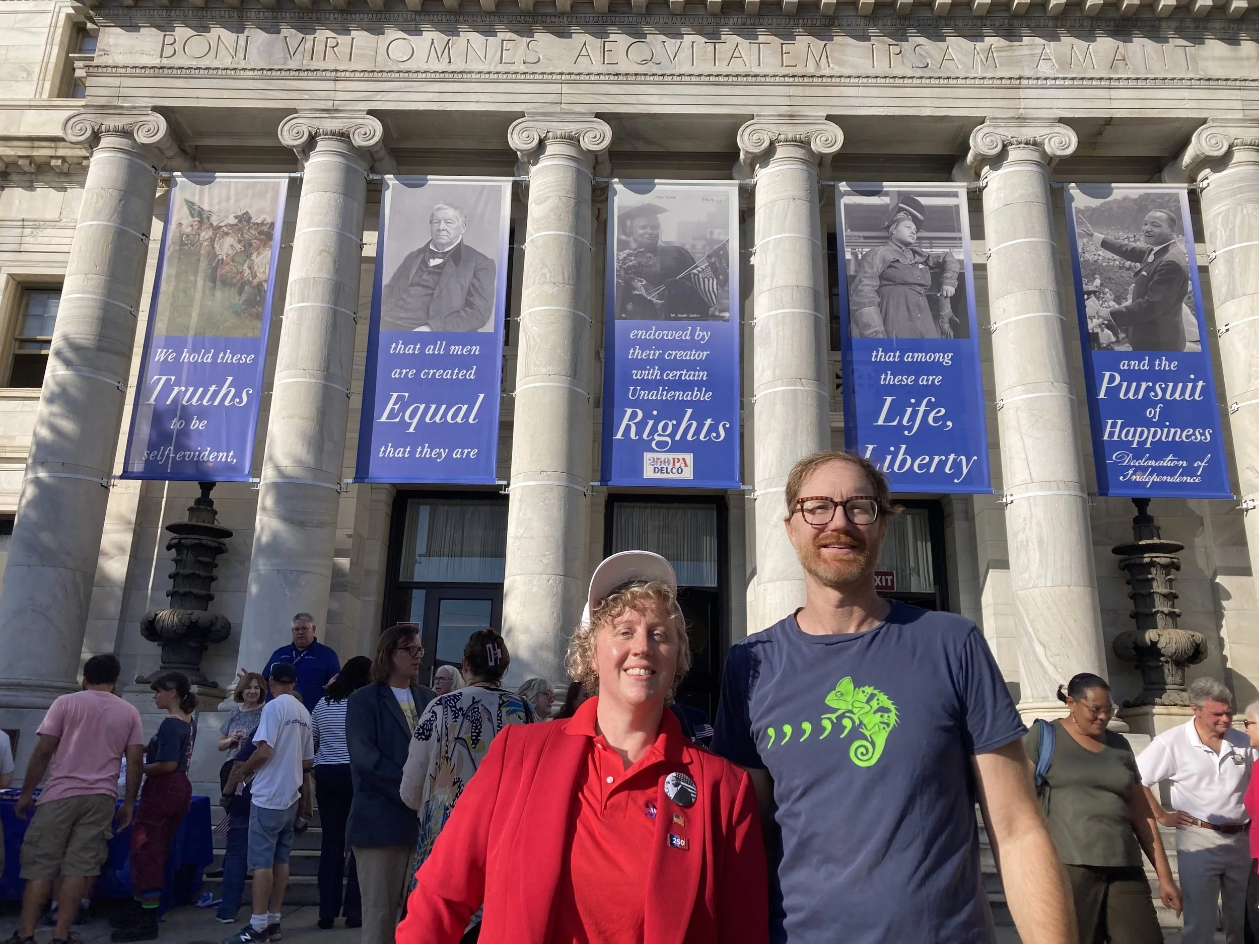 Director of America 250PADelco Andrea Silva (left) and MAC Artistic Director Jeff Thomas (right) at the banner unveiling.